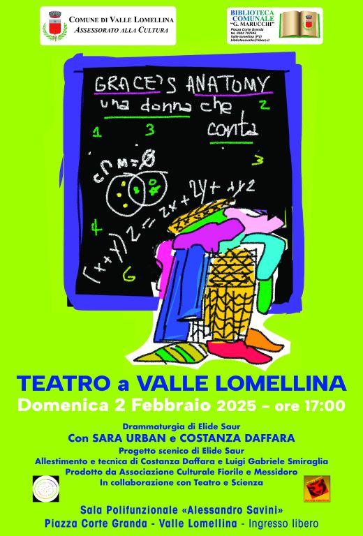 Domenica 2 febbraio 2025, alle ore 17:00, in sala polifunzionale “Alessandro Savini” a cura dell’Amministrazione Comunale - assessorato alla Cultura - e della biblioteca, andrà in scena GRACE’S ANATOMY. UNA DONNA CHE CONTA, drammaturgia di Elide Saur con Sara Urban - che abbiamo già applaudito a scena aperta nella interpretazione del dramma di Franca Viola- e, Costanza Daffara.