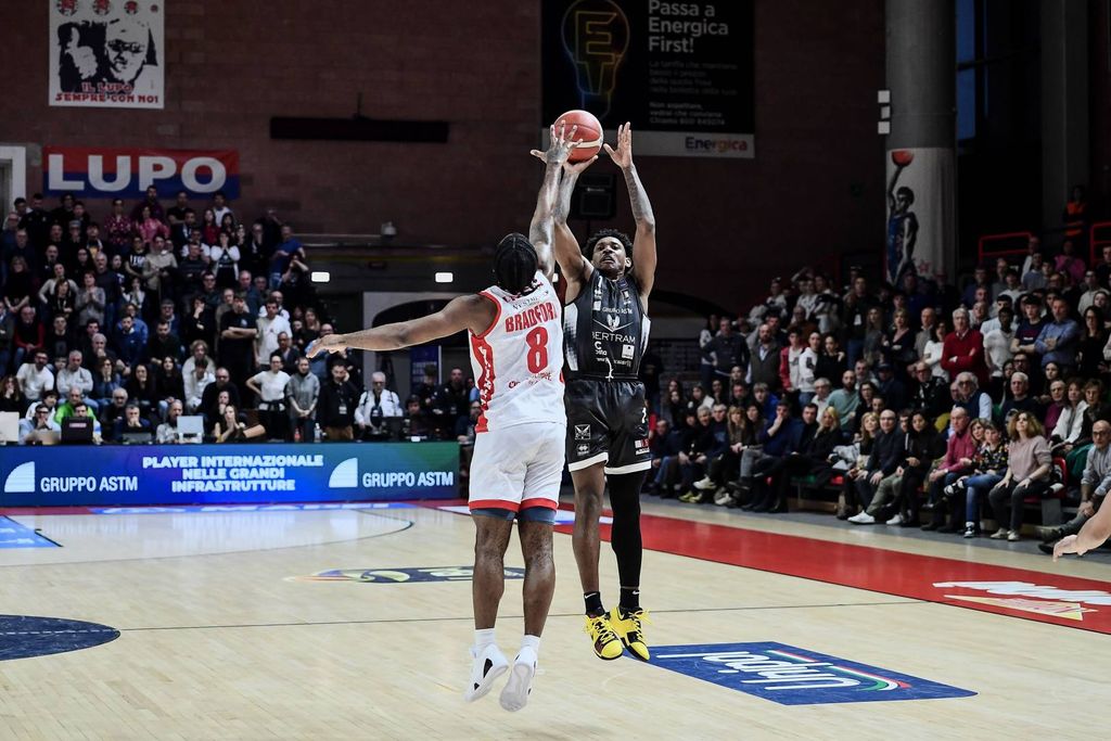 Una partita infinita porta ad una vittoria entusiasmante la Bertram Derthona Tortona. Sono servite due ore e 25 minuti alla squadra bianconera per battere la resistenza dell’Openjobmetis Varese, 89-82 il punteggio finale per i padroni di casa dopo un tempo supplementare nell’incontro della 21^ giornata della Serie A Unipol. Una gara ripresa per i capelli nell’esaltante atmosfera del PalaEnergica Paolo Ferraris di Casale Monferrato, con due triple a far esplodere di gioia i padroni di casa sul finale dei regolamentari e dell’overtime: la prima di Vital a 2” dal termine per l’insperata parità a quota 75 con un tiro marcatissimo sulla difesa di Bradford (nella foto) e la seconda con la stessa guardia americana a servire con freddezza l’assist per un altro difficile canestro da tre di Kuhse che a 29” da fine overtime ha messo più di un possesso di distanza tra le due squadre. Un vantaggio mai più ribaltato dalla fin lì indomabile formazione ospite, arrivata ad un niente dal portare a casa due punti di fondamentale importanza per le sue speranze di allontanarsi dalla zona rossa della classifica, sostenuta dal tifo di centinaia di varesini. Viceversa, ne sono usciti fuori due punti con cui la Bertram risponde al successo, sempre in volata, di qualche ora prima della diretta concorrente Venezia a Sassari per difendere con i denti la sua posizione-playoff, restando due punti avanti ai lagunari grazie alla dodicesima gioia in campionato.
