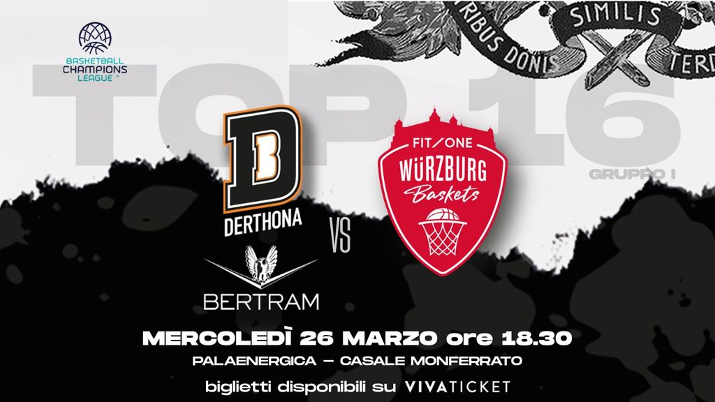 A partire da mezzogiorno di oggi, giovedì 20 marzo, scatta la vendita dei biglietti per assistere alla prossima gara casalinga di Champions League della Bertram Derthona. Mercoledì 26 marzo al PalaEnergica Paolo Ferraris di Casale Monferrato c’è la sfida-spareggio delle Top 16 della squadra bianconera per la qualificazione ai quarti di finale contro i tedeschi del FIT/One Würzburg, in programma alle ore 18:30 per la 6^ e ultima giornata del Girone I della seconda fase della principale competizione continentale per club della FIBA.
