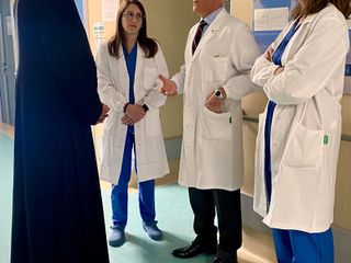 In occasione dell’Anno Giubilare, il Vescovo di Pavia, S.E. Corrado Sanguineti, oggi ha fatto visita all’IRCCS Maugeri Pavia, prima tappa del suo percorso di incontri con le strutture sanitarie cittadine. Il Vescovo, accompagnato dalla Vice Presidente del Gruppo Chiara Maugeri, insieme a Don Gian Paolo Sordi, Assistente Spirituale Maugeri, alla dott.ssa Antonella Mastretti, Direttore Sanitario d'Istituto IRCCS Maugeri Pavia, a Giorgio Franchi, Direttore Amministrativo IRCCS Maugeri Pavia, alla dott.ssa Maria Gigliola Rosignoli, Direttore Sanitario Centrale Maugeri e ad Alessandro Procaccini, Direttore Istituto IRCCS Maugeri Pavia, ha incontrato i pazienti ricoverati in alcuni reparti, portando parole di conforto e confrontandosi con medici, infermieri e ricercatori.