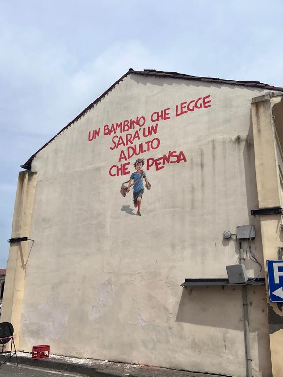 L'opera è stata realizzata in 48 ore dal pittore-artista medese Germano Casone che su volontà dell'amministrazione comunale, ha dipinto il soggetto raffigurante un bambino che corre con un libro nella mano, allo scopo di veicolare la funzione educativa del sistema interbibliotecario lomellino e incentivare i bambini e i ragazzi alla lettura quale investimento sul proprio futuro di crescita personale e umanistica.