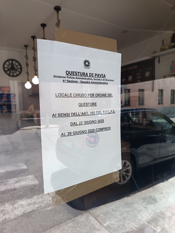Il questore della provincia di Pavia ha disposto la sospensione per giorni 5 (dal 25 giugno al 29 giugno compreso) di un esercizio pubblico di somministrazione di alimenti e bevande sito a Vigevano in via Del Carmine.