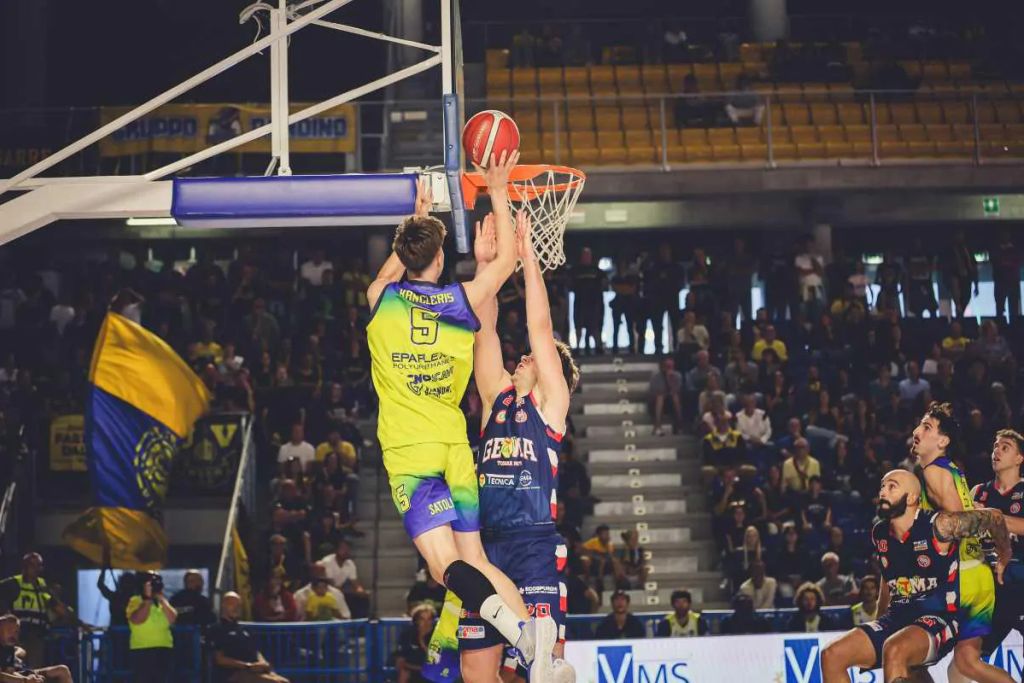 Davanti a quasi 1749 spettatori la squadra allenata da Stefano Salieri ha pagato nel primo tempo lo scotto dell'esordio davanti al proprio pubblico, fiendo sotto anche di 12 punti (20-32 al 15'), poi con i punti di Corgnati e Verazzo e l'energia sotto canestro di Kancleris ha rosicchiato via via lo svantaggio ai toscani, fino a operare addirittura il soprasso sul 64-60 del 35', quando lo stesso Verazzo ha infilato una tripla con fallo.