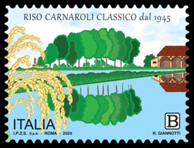 L’amore e la passione per il riso hanno alimentato il desiderio di Cristiana Sartori di far realizzare un francobollo per gli 80 anni della varietà Carnaroli, con l’aiuto dell’artista e vignettista savonese, Roberto Giannotti (collezionista filatelico e socio dell’Unione Stampa Filatelica Italiana): un sogno coronato da entrambi e che ora fa parte del patrimonio filatelico italiano. Il 10 settembre 2025, nell’ambito della serie tematica “Le eccellenze del sistema produttivo e del Made in Italy” ecco l’emissione presso Palazzo Piacentini a Roma, sede del Mimit, del francobollo dedicato agli 80 anni del riso Carnaroli (tiratura 200.025 esemplari). Dalla penna di Giannotti è nato un incantevole bozzetto che riproduce una risaia, un casolare sullo sfondo e pannocchie di riso in primo piano, che caratterizza, in Lombardia, tutta la zona della provincia di Pavia a vocazione risicola, dove è radicata la coltivazione del Riso Carnaroli Classico.