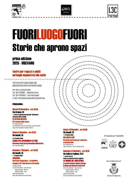 FuoriLuogoFuori è un’iniziativa unica nel suo genere, una rassegna di teatro per ragazzi e per adulti ideata e realizzata da due realtà teatrali attivamente impegnate nel teatro e nella promozione sociale Scarpanō – Teatri e Metodi Attivi e Le Tre Corde Società Cooperativa. La rassegna è realizzata in collaborazione con l’associazione LIBERA - Presidio di Vigevano e con il patrocinio del Comune di Vigevano.