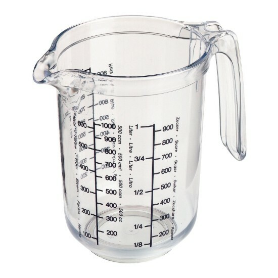 Bicchieri/caraffe graduate (misurini per liquidi): Sono solitamente realizzati in plastica trasparente o vetro e presentano scale graduate per diverse unità di misura, come millilitri (ml), centilitri (cl), litri (l) e, a volte, tazze.