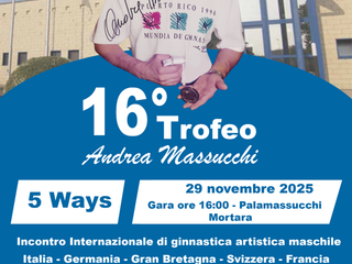 Lo sguardo ora si sposta già al prossimo futuro. Sabato 29 novembre il Palamassucchi di Mortara sarà teatro di un evento di alto profilo: il 16° Trofeo Andrea Massucchi e la gara ‘’5 ways’’ una gara internazionale di ginnastica artistica maschile che vedrà sfidarsi, a partire dalle ore 16.00, le rappresentative di Italia, Germania, Gran Bretagna, Svizzera e Francia.