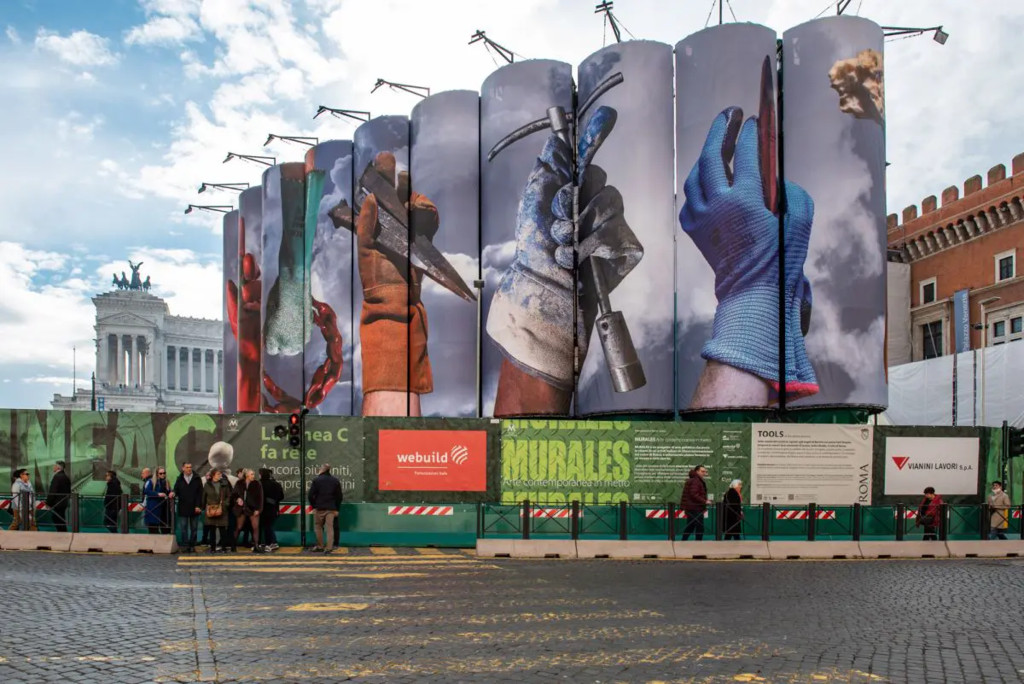 ROMA (ITALPRESS) - Piazza Venezia si conferma palcoscenico di arte pubblica con l'inaugurazione di 'TOOLS' di Elisabetta Benassi, la terza installazione del ciclo 'MURALES. Arte contemporanea in metrò, opera omaggio alla comunità dei lavoratori - archeologi e operai - i veri 'Eroi Nascostì, il cui sforzo quotidiano è oggi motore della trasformazione infrastrutturale di Roma. Il progetto artistico è realizzato grazie al consorzio costruttore della Linea C della Metropolitana di Roma guidato da Webuild e Vianini Lavori, con il patrocinio di Roma Capitale e in collaborazione con le Soprintendenze competenti, con l'obiettivo di trasformare il cantiere in un simbolo di innovazione e rigenerazione urbana, coniugando la bellezza di Roma con la sua necessità di evolvere. Alla cerimonia di svelamento dell'opera hanno partecipato il sindaco di Roma Roberto Gualtieri, Renata Cristina Mazzantini Direttrice della Galleria d'Arte Moderna e Contemporanea di Roma e presidente del Comitato Scientifico del progetto Murales e l'artista Elisabetta Benassi, insieme a Pietro Salini, Amministratore Delegato di Webuild e Vincenzo Onorato, Amministratore Delegato di Vianini Lavori. Presenti inoltre per il consorzio Metro C, Franco Cristini e Fabrizio Paolo Di Paola, rispettivamente Presidente ed Amministratore Delegato della società. "Roma è nata dal lavoro, dalla stratificazione incessante generata da mani, visioni e materiali, che hanno costruito la sua storia millenaria - ha dichiarato Salini - E' questa la forza che l'opera celebra: il lavoro collettivo degli operai e degli archeologi che sta trasformando il sottosuolo per costruire la Roma moderna. Questo cantiere, che con il progetto 'MURALES' diventa una piattaforma culturale, è la testimonianza visibile di un impegno che va oltre l'ingegneria. Stiamo lavorando per contribuire a dare a questa città infrastrutture essenziali per la mobilità e la connettività. La Linea C è una spina dorsale della città realizzata in condizioni ingegneristiche e archeologiche complesse, che procede anche grazie alla stretta collaborazione tra imprese, istituzioni e comunità, con l'obiettivo comune di rendere Roma sempre più moderna e all'avanguardia".In 'TOOLS', l'artista si è concentrata sulle mani degli operai e degli archeologi del cantiere, fotografate mentre stringono gli strumenti del loro lavoro quotidiano (chiavi inglesi, scalpelli, cavi elettrici, catene, bulloni, spugne), per costruire ma anche per riportare alla luce reperti preziosi dal passato. L'opera stabilisce un legame simbolico e storico profondo con la città, ispirandosi ai simboli utilizzati per gli Angeli del Bernini su Ponte Sant'Angelo a Roma, che recano gli strumenti della Passione di Cristo. Come quegli angeli, sette lavoratori del cantiere tengono in mano i loro strumenti di lavoro, unendo sacro e laico, antico e contemporaneo in un'immagine doppia. Se gli strumenti del Bernini raccontano un momento drammatico, quelli rappresentati dall'operaevocano l'epicità del lavoro quotidiano - stringere, serrare, pulire, scalpellare, scavare - celebrando la forza simbolica della creazione e del saper fare. La nuova opera inedita, dedicata al tema del lavoro, nell'ambito del progetto 'MURALES' a cura di Spazio Taverna, prende il posto di 'Ci eleviamo sollevando gli altrì di Marinella Senatore, a sua volta succeduta a 'Costellazioni di Romà di Pietro Ruffo, continuando a trasformare i silos del cantiere della Stazione Venezia in una monumentale installazione a cielo aperto. Il progetto 'MURALES' si inserisce in un quadro di avanzamento dei lavori cruciali per la Capitale: nel cantiere di Stazione Venezia ha visto completare la prima macrofase dei lavori, con scavi fino a 85 metri di profondità che porteranno alla luce l'antica Via Flaminia, per passare poi alla nuova macrofase. In parallelo, il consorzio costruttore ha consegnato due archeo-stazioni cruciali, Colosseo/Fori Imperiali e Porta Metronia, la cui apertura al pubblico è prevista il 16 dicembre. Queste stazioni sono un modello internazionale di successo frutto di una stretta collaborazione tra istituzioni e imprese, che ha permesso tra l'altro di valorizzare il ritrovamento di una caserma romana a Porta Metronia. L'impegno del consorzio prosegue anche per la progettazione esecutiva della Tratta T2 (Venezia-Clodio/Mazzini) che include due nuove archeo-stazioni, San Pietro e Chiesa Nuova.- Foto ufficio stampa Webuild -(ITALPRESS).