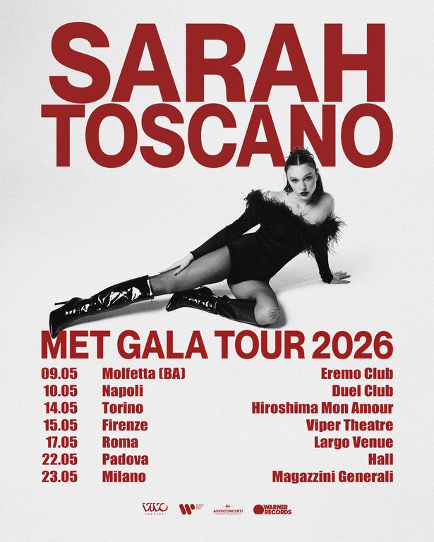 Dopo il successo del 2025 con il tutto esaurito per la data di Roma e Milano SARAH TOSCANO è pronta a tornare sul palco nel 2026 e annuncia il Met Gala Tour 2026, in partenza da maggio 2026 e interamente prodotto da Vivo Concerti.