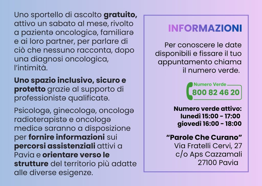 Il progetto intende rivolgersi non solo a chi sta affrontando un tumore, ma anche ai partner e ai familiari, figure fondamentali nel percorso di cura e convivenza con la malattia, che spesso sono chiamati ad affrontare un pesante carico emotivo e relazionale. Lo Sportello, ubicato in Via Fratelli Cervi 27 presso Aps Cazzamali, sarà attivo un sabato al mese, nella fascia oraria dalle 10:00 alle 12:00. Per conoscere le date disponibili e fissare un appuntamento, è possibile chiamare il numero verde 800 824620, attivo il lunedì dalle 15:00 alle 17:00 e il giovedì dalle 16:00 alle 18:00.