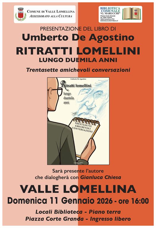 Con l’inizio del nuovo anno riprendono gli incontri culturali organizzati dalla Biblioteca comunale “G. Marucchi” in collaborazione con l’Assessorato alla cultura di Valle Lomellina. Domenica 11 gennaio, alle ore 16:00, sarà ospite nei locali della biblioteca, in piazza Corte Granda, il giornalista e scrittore Umberto De Agostino, che presenterà al pubblico la sua ultima fatica letteraria, dal titolo Ritratti lomellini lungo duemila anni. Se la collocazione dell’incontro, cioè la sala al piano terra della biblioteca, risulta una novità (destinata a favorire un approccio di maggiore prossimità con le persone, quasi una sorta di chiacchierata informale su argomenti di interesse comune), non si può dire altrettanto del relatore: nel corso degli anni, infatti, Umberto De Agostino è diventato un habitué degli appuntamenti culturali vallesi – un amico più che un ospite.