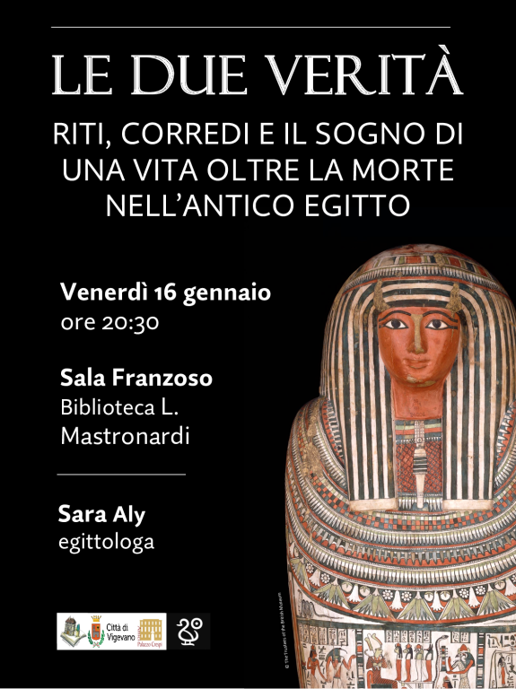 Venerdì 16 gennaio alle ore 20.30, presso la Sala Franzoso della Biblioteca Mastronardi di Vigevano, si terrà l’incontro Le due verità. Riti, corredi e il sogno di una vita oltre la morte nell’antico Egitto, a cura di Sara Aly.