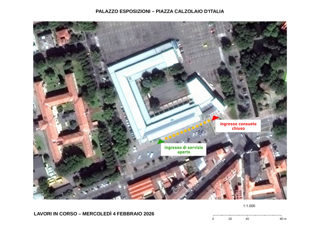 Per accedere agli uffici comunali i cittadini potranno utilizzare l’ingresso di servizio posto sempre in Piazza Calzolaio d’Italia, a circa 60 metri di distanza, sul lato di Palazzo Esposizioni rivolto verso Via Sacchetti, accanto all’ingresso di Fondazione Roncalli - Area Formazione e nei pressi della Casa dell’Acqua collocata in fondo all’area di parcheggio a pagamento (come da mappa allegata).