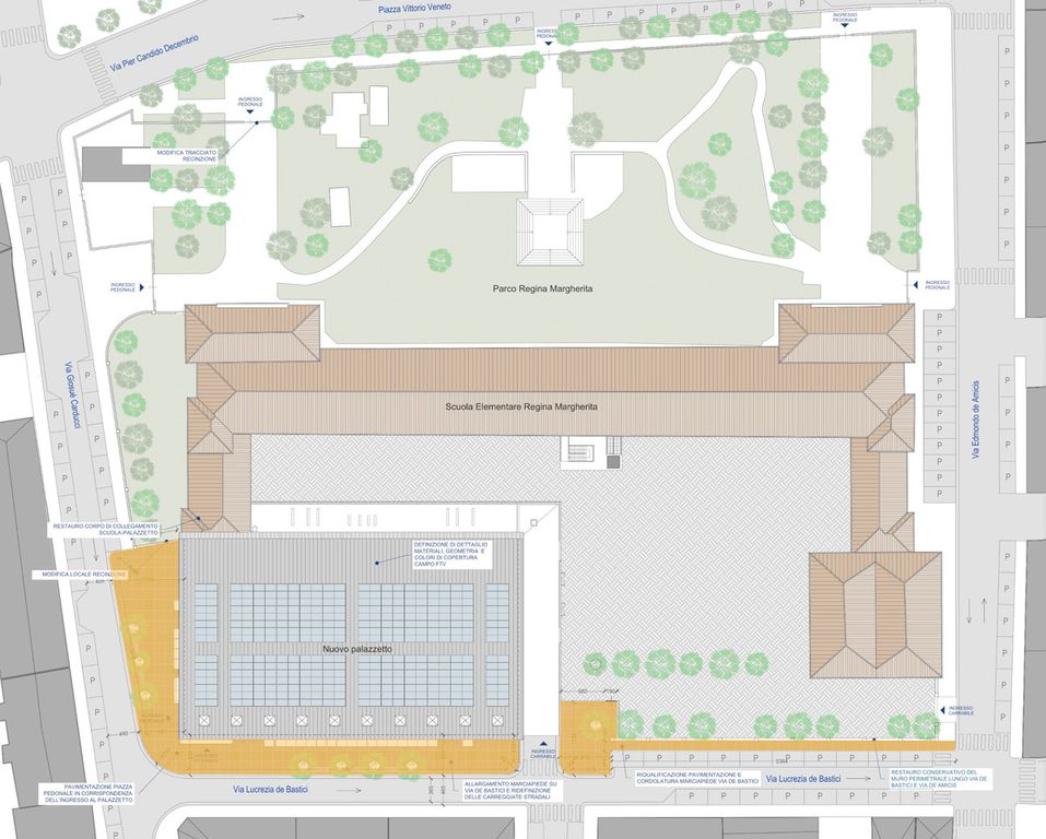 Di fronte all’ingresso del palazzetto si prevede la sistemazione di una piazzetta pedonale in porfido, ottenuta allargando localmente il marciapiede ed eliminando una fila di posti auto. La pavimentazione in porfido proseguirà anche oltre il palazzetto nel tratto terminale di via de Bastici, con un allargamento del marciapiede esistente che ne assicurerà la fruibilità in sicurezza da parte di tutte le categorie di utenza. Il nuovo ingombro dell’area pedonale pavimentata così come ridefinita, oltre a meglio valorizzare la nuova architettura, consentirà di gestire l’area esterna per eventi superiori alle 500 persone (Area di Servizio), che potrà essere interamente delimitata all’interno dell’area pedonale, garantendo una superficie di circa 650 mq con una profondità di almeno 6 metri (nel rispetto delle norme CONI e antincendio), senza invadere le carreggiate stradali mediante recinzioni temporanee come invece previsto in precedenza.