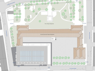 Di fronte all’ingresso del palazzetto si prevede la sistemazione di una piazzetta pedonale in porfido, ottenuta allargando localmente il marciapiede ed eliminando una fila di posti auto. La pavimentazione in porfido proseguirà anche oltre il palazzetto nel tratto terminale di via de Bastici, con un allargamento del marciapiede esistente che ne assicurerà la fruibilità in sicurezza da parte di tutte le categorie di utenza. Il nuovo ingombro dell’area pedonale pavimentata così come ridefinita, oltre a meglio valorizzare la nuova architettura, consentirà di gestire l’area esterna per eventi superiori alle 500 persone (Area di Servizio), che potrà essere interamente delimitata all’interno dell’area pedonale, garantendo una superficie di circa 650 mq con una profondità di almeno 6 metri (nel rispetto delle norme CONI e antincendio), senza invadere le carreggiate stradali mediante recinzioni temporanee come invece previsto in precedenza.