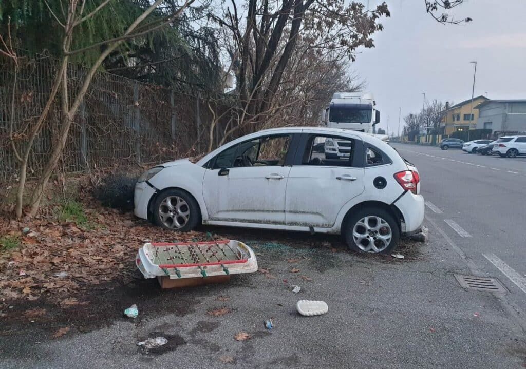 Un’auto completamente vandalizzata, con i finestrini in frantumi e le ruote bucate, è comparsa da qualche tempo in via Bachelet, nella zona industriale di Magenta. Il veicolo, completo di targa, si presenta in condizioni pessime: all’interno sono stati rinvenuti diversi sacchi contenenti rifiuti, mentre tutt’attorno si trovano vetri rotti e altri materiali abbandonati.