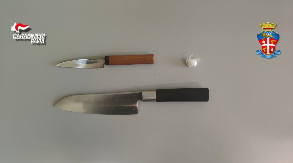 Dalla perquisizione veicolare e personale sono emersi due coltelli da cucina di 30 e 17 cm, sottoposti immediatamente a sequestro, nonché una dose di cocaina di 0,8 grammi.