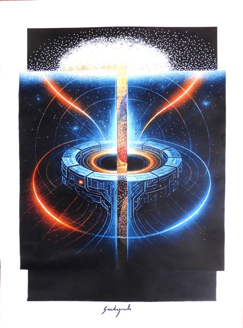 Dopo la chiusura della mostra, l’esperienza vissuta al CNAO ha continuato a risuonare nell’immaginazione di Guadagnuolo, generando un impulso creativo che va oltre la dimensione espositiva. L’incontro con la fisica applicata alla cura, con la potenza silenziosa del Sincrotrone e con l’umanità dei pazienti e dei ricercatori ha aperto nell’artista un nuovo fronte di ricerca, spingendolo a interrogare ciò che normalmente resta fuori dal dominio della percezione. Da questa risonanza è nata l’idea di sviluppare un ciclo di opere in chiave scientifica, un percorso che esplora campi, particelle, orbite, energie e processi invisibili, traducendoli in forme poetiche e visionarie.