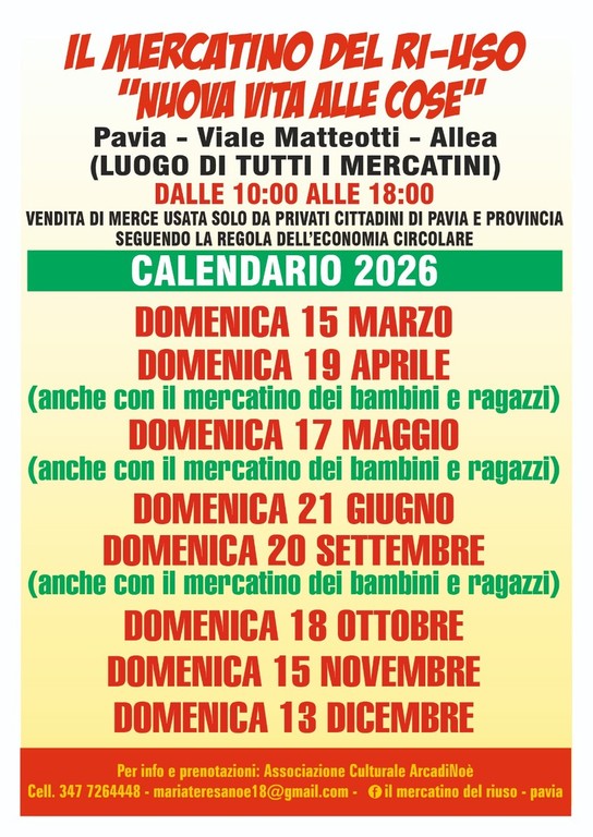 L'evento è gratuito e aperto a tutti, con la possibilità di partecipare previa prenotazione per chi desidera esporre i propri oggetti: la vendita di merce usata è solo tra privati cittadini di Pavia e provincia. Per ulteriori informazioni e per prenotare il proprio spazio, è possibile contattare l'Associazione Culturale l’Arca di Noé al 347 7264448.
