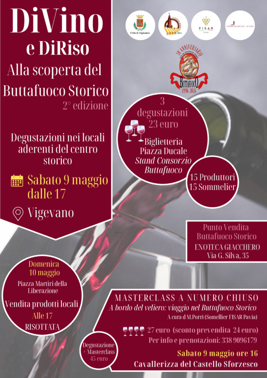 Sabato 9 e domenica 10 maggio 2026 il centro storico della città ospiterà la seconda edizione dell’evento DiVino e DiRiso - Alla scoperta del Buttafuoco Storico, organizzato dal Comune di Vigevano con la collaborazione del Distretto Urbano del Commercio “La Dimora Sforzesca”, il Consorzio Club del Buttafuoco Storico e Fisar Pavia.